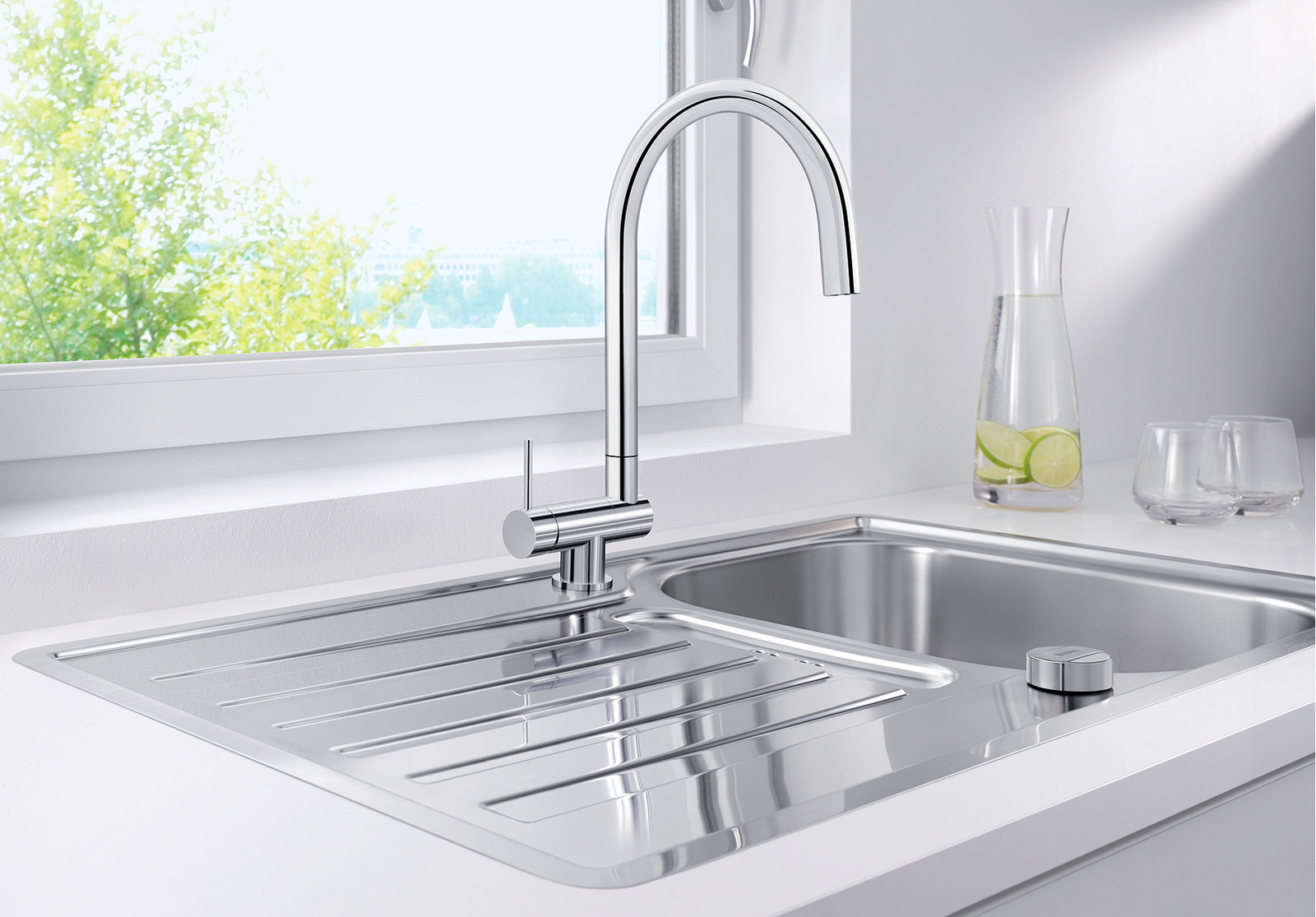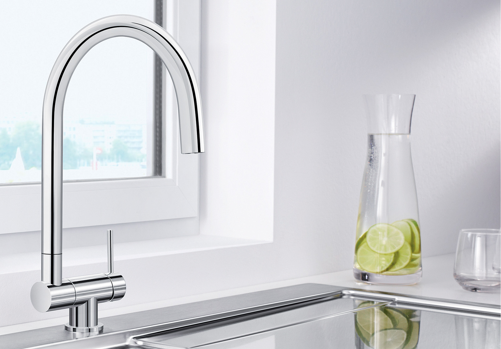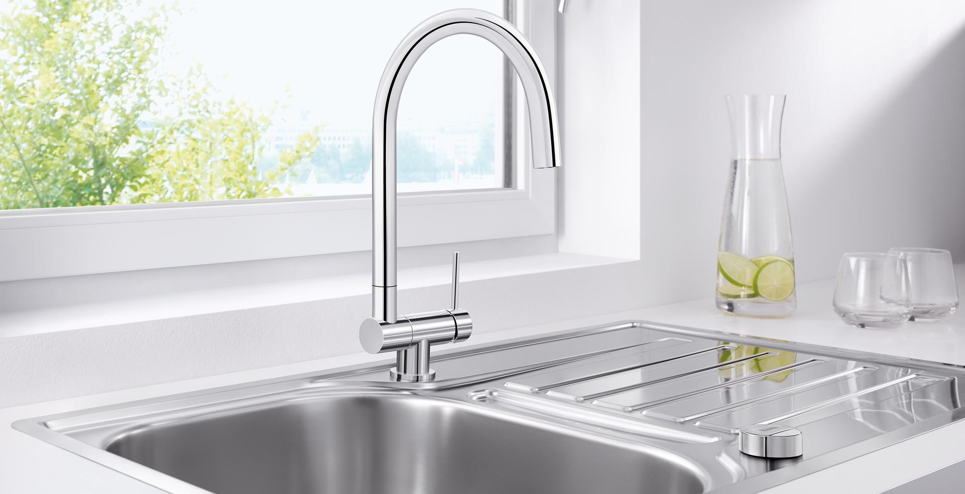 Складной смеситель для установки перед окном Blanco Coressa-F выпускается в двух вариантах: с рычагом справа и слева. Очень удобный смеситель, который подойдет вам, если вы решили установить кухонную мойку перед окном: высокий излив смесителя легко складывается, наклоняясь вперед.